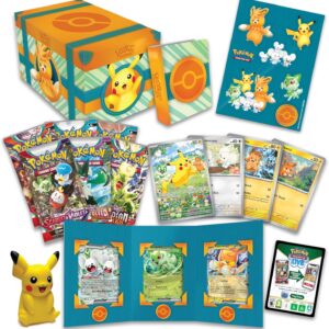 ¡A los Entrenadores Pokémon les espera todo un mundo de aventuras en la región de Paldea! Prepárate para el combate con un montón de cartas de promoción listas para jugar que incluyen Pokémon tan adorables como peleoneros. Y, por si esto fuera poco, ¡también encontrarás un buen puñado de paquetes de mejora para hacer aún más amigos! Además, podrás decorar tus dispositivos con calcomanías especiales, presumir tu colección con un miniálbum y entretenerte con un muñeco apretable de Pikachu.